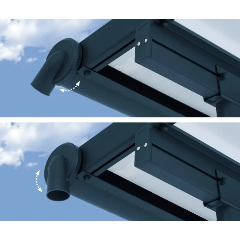- Le grondaie integrate e le teste delle grondaie regolabili (2), ciascuna di 2 pollici di diametro, consentono un facile drenaggio e la raccolta dell’acqua piovana per un sistema di irrigazione sostenibile.