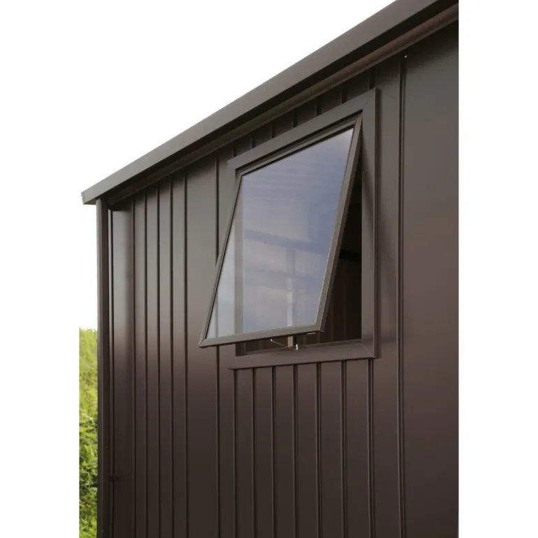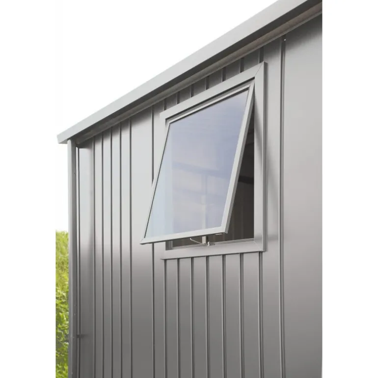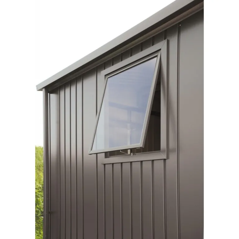 L’elemento parete laterale dotato di una finestra a compasso con telaio in metallo (vetro in acrilico) porta ancora più luce nella casetta porta attrezzi e offre un’ampia visuale del giardino (apertura della finestra: 50 x 60 cm).