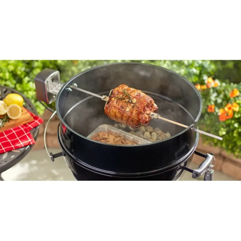 Il girarrosto per il modello a carbone include un anello in acciaio, lo spiedo e il motore. Il girarrosto fa ruotare la carne in modo che il pollame e i grandi arrosti ottengano un’uniforme esposizione al calore, regalando ogni volta meravigliosi risultati.