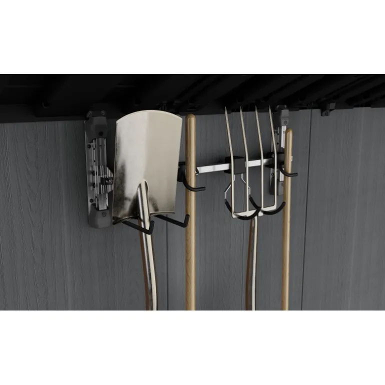 Kit per organizzare lo spazio all’interno delle casette Keter (esclusa linea Factor). Dotato di 4 ganci per appendere oggetti (per esempio attrezzi a manico come scope, rastrelli, badili). Struttura in metallo.
