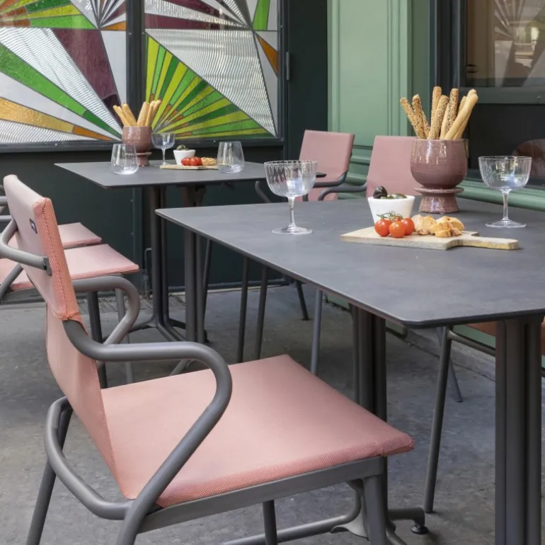 Per la sua linea di mobili dedicata alle caffetterie, agli hotel e ai ristoranti, LAFUMA MOBILIER ha collaborato con lo studio di design BIG-GAME. La collezione HORIZON è l’alleanza tra uno “smart design”, comfort, stile e funzionalità. È disponibile in piani di 4 formati per adattarsi a tutte le terrazze di caffetterie, hotel e ristoranti: quadrato 59 x 59 cm, quadrato 69 x 69 cm, rettangolare 115 x 69 cm e rotondo Ø69 cm. In aggiunta ai piani le gambe dei tavoli HORIZON sono dotate di impugnature brevettate e di sistemi d’ammortizzazione in elastomero che accompagnano i movimenti di chiusura/apertura per un maggiore comfort di utilizzo. Le gambe sono disponibili in 2 versioni: semplice e doppia e 3 altezze: standard, middle e high. Questo piano stratificato compatto HPL, dal formato 115 x 69 cm consente di far accomodare comodamente 4 commensali.
