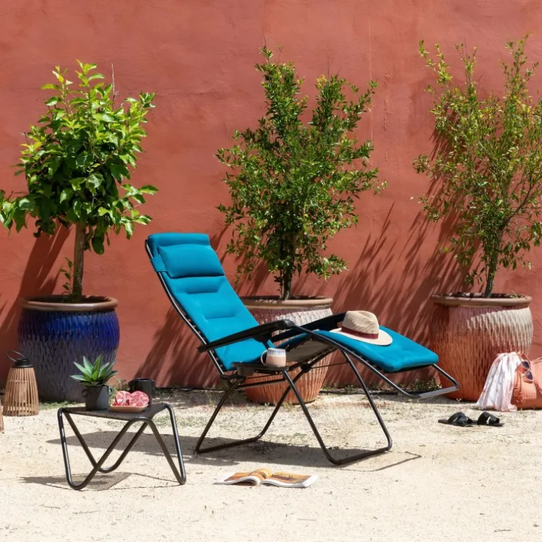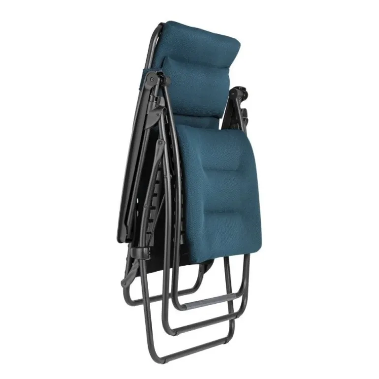 – Tela imbottita: AirComfort®, imbottitura a 3 spessori, traspirante, asciugatura rapida. Tela removibile e sostituibile con fissaggio tramite clip in elastomero (brevetto LAFUMA MOBILIER).