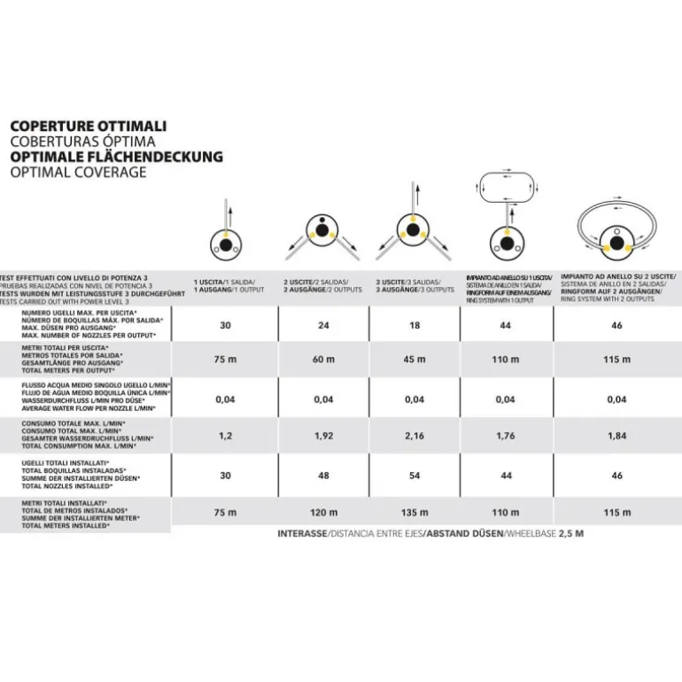 Il potente sistema di nebulizzazione ultra-fine, con una pressione di 5 bar e un flusso di 0,04 l/min per ugello, assicura una distribuzione uniforme e precisa del trattamento, garantendo risultati ottimali in ogni condizione.