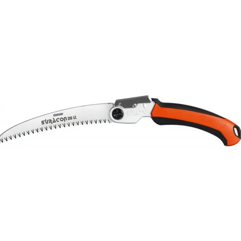 Seghetto pieghevole con lama curva e chiusura automatica, per uso professionale, per tutti i lavori di potatura e giardinaggio, realizzato con materiali di alta qualità. Grazie al trattamento termico ad impulsi, le punte dei denti sono molto resistenti e di lunga durata e garantiscono un taglio perfetto. Tutti i ricambi sono facilmente sostituibili. – Lama curva in acciaio speciale cromato – Taglio tirante – Impugnatura ergonomica in polipropilene – Antiscivolo in morbida gomma sintetica (materiale TPA). Lunghezza lama: 21 cm Peso: 268 g