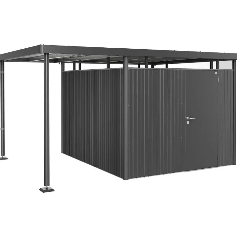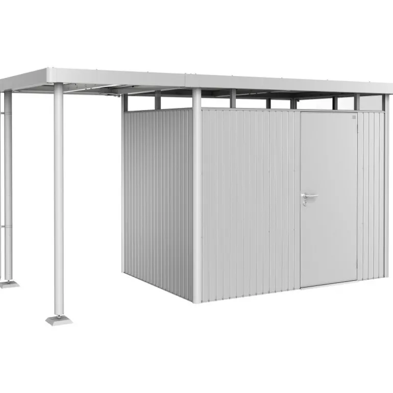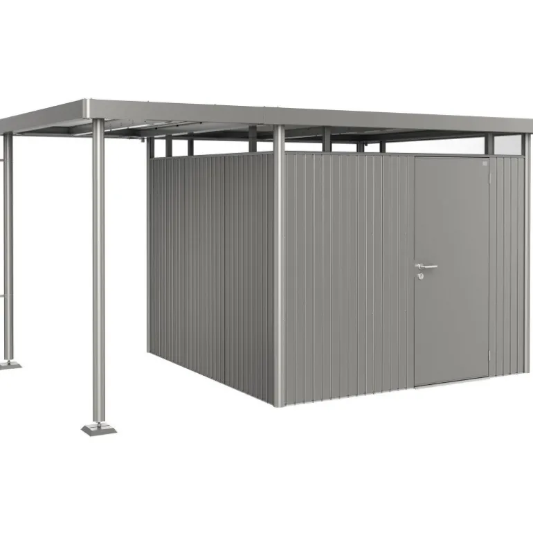 La tettoia laterale viene fissata alla casetta porta attrezzi HighLine (a partire dalla mis. H2) dalla parte con la grondaia, su uno o su entrambi i lati, a seconda delle preferenze. È disponibile in due diversi formati. I supporti in alluminio sono dotati di piedini regolabili in altezza. Il tubo pluviale è incluso. Il tetto della tettoia laterale è sempre grigio quarzo metallizzato.