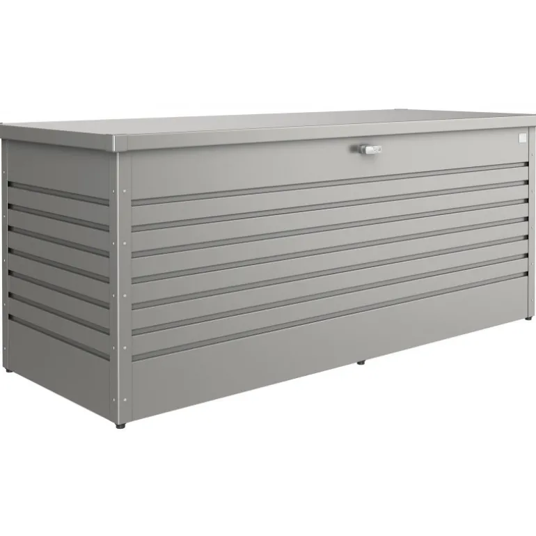 Baule da esterno in lamiera d’acciaio zincata a caldo, termoverniciatura poliammidica in 5 colori: bianco, argento metallizzato, grigio quarzo metallizzato, grigio scuro metallizzato e bronzo metallizzato. Il baule è dotato di serratura a cilindro con maniglia girevole e facile apertura del coperchio grazie al pistone pneumatico