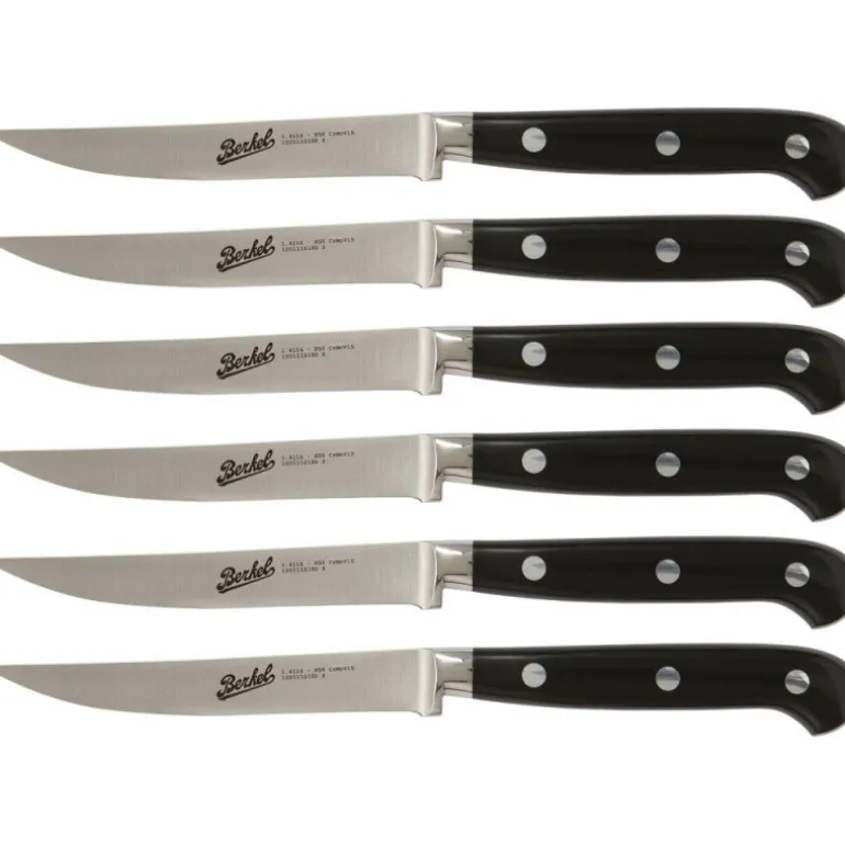 Questo set di sei coltelli da bistecca si caratterizza per la lama corta e il manico maneggevole dotato di rivetti. Grazie alla punta e all’affilatura, i coltelli consentono di tagliare con precisione la carne cotta, limitando gli sfilacciamenti. Set per sei commensali in acciaio inox, è pensato per resistere alla corrosione e allo sfregamento con la ceramica del piatto, garantendone l’uso quotidiano e la durata nel tempo.