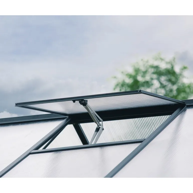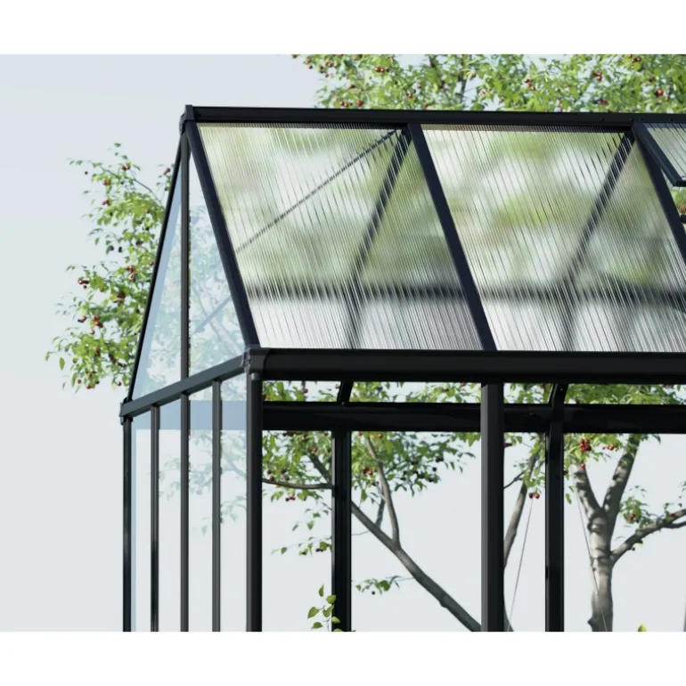 - Pannelli del tetto in policarbonato resistenti: pannelli in policarbonato a doppia parete da 10 mm che trasmettono oltre l’80% della luce, offrendo un ambiente luminoso e favorevole alla crescita, con protezione UV integrata e sicurezza.