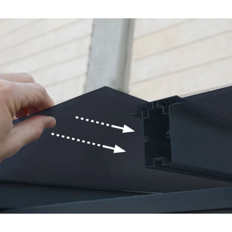 - Pannelli sul tetto in policarbonato doppio da 6 mm praticamente indistruttibili verniciati in bronzo che favoriscono 15% di passaggio di luce