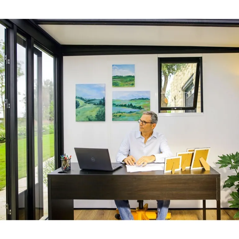 Scopri l’Ufficio in Giardino Canopia Copenhagen 3.5X3 m, il tuo spazio di lavoro personale all’aperto. Con il suo design scandinavo moderno, offre un ambiente di lavoro tranquillo e isolato, perfetto per la concentrazione. Dotato di pareti a triplo isolamento, è resistente alle intemperie e offre comfort tutto l’anno. Personalizza la vista e la luce naturale con il pannello del tetto apribile e le due finestre. Facile da installare, con spazio per nascondere cablaggi e tubi.