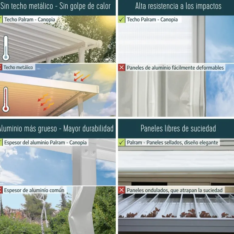 - Tecnologia Heat Block: Il sistema del tetto a prova di perdite utilizza pannelli in policarbonato “Solar Control” solidi da 3 mm con tecnologia Heat Block che protegge dai raggi UV nocivi, riduce il calore diretto e tiene fuori pioggia e rugiada.