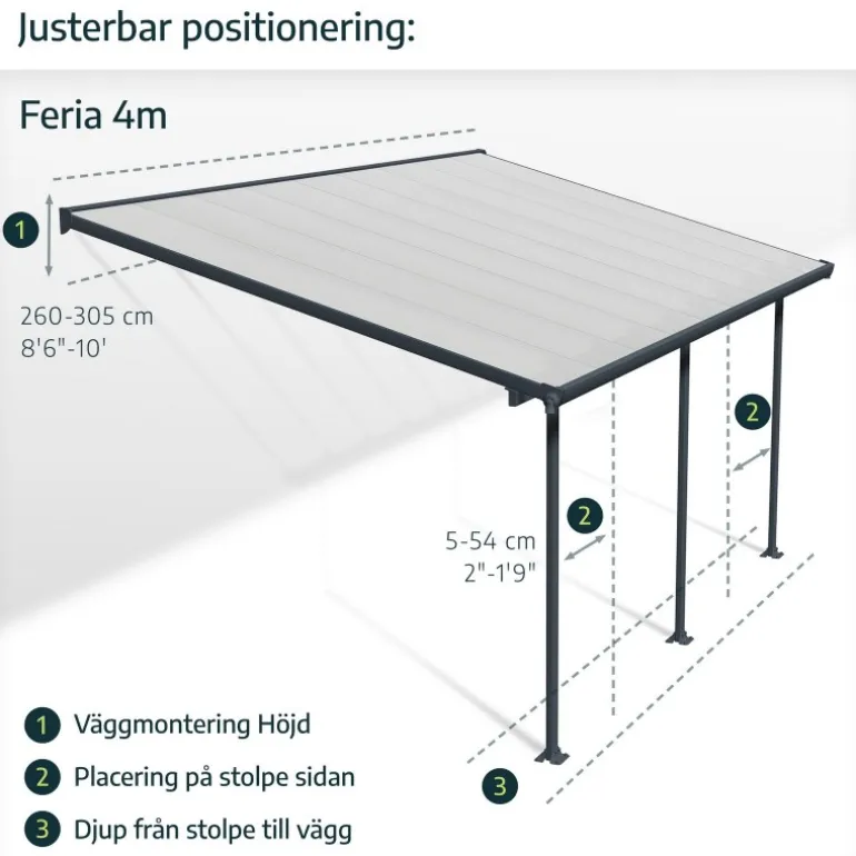Valorizzate il vostro spazio esterno con la copertura per patio Palram – Canopia Sierra, una soluzione di copertura esteticamente gradevole e versatile. Godetevi il vostro spazio all’aperto tutto l’anno con questa aggiunta elegante e robusta. Godetevi le riunioni di famiglia e i barbecue senza preoccuparvi che il tempo capriccioso possa rovinare il vostro divertimento. Sierra è una soluzione estetica, versatile e priva di manutenzione, adatta a una varietà di applicazioni esterne, come tende da sole per balconi o patio, lettini, tende per porte, ecc.Sierra è una struttura di posizionamento potente e flessibile che consente di impostare l’altezza desiderata all’attacco della parete, la distanza dalla casa e tra i pali ovali frontali. È progettata per essere facilmente assemblata da 2 persone, con il sistema di pannelli scorrevoli che garantisce un montaggio facile e sicuro; non richiede esperienza, né abilità particolari, né strumenti speciali. Sierra offrirà alla vostra famiglia uno spazio di vita all’aperto elegante, robusto e privo di ruggine per gli anni a venire.