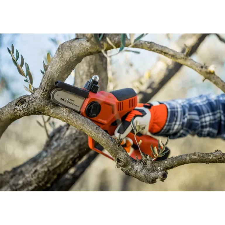 La motosega Magma E-100 LM è una pratica e funzionale motosega a batteria. La presa ergonomica ed il peso ridotto, solo 1600 gr, riducono lo sforzo e permettono all’operatore di non affaticare la mano. Il motore brushless e l’arpione in dotazione che direziona il taglio garantiscono una grande efficienza con una velocità di taglio che raggiunge i 12 m/s. La motosega Magma E-100 LM è dotata di due batterie Li-Ion ricaricabili da 2,6 Ah / 21,6 V con cui si possono effettuare fino a 80-100 tagli con un diametro di 6 cm, il che la rende ideale per la potatura e la cura del verde. Lo schermo a LED aiuta a visualizzare lo stato di carica rimanente ed il tempo di lavoro dell’attrezzo finora utilizzato. La versatilità d’uso si può inoltre intuire dalla facilità e dalla semplicità con cui si può effettuare il cambio catena: attraverso un sistema integrato e ultrasicuro di svitamento del bullone si può accedere al bullone di chiusura della spranga, il quale, una volta estratto, consente di accedere alla spranga e conseguentemente alla catena. La catena può essere lubrificata all’evenienza, grazie al suo sistema di pompaggio manuale e può essere sostituita facilmente. Il kit di manutenzione incluso permette di prolungare la vita della motosega Magma E-100 LM grazie alla facile e rapida procedura di manutenzione. Completa il tutto la valigetta per il trasporto comodo e in sicurezza, con lo spazio per riporre fino a tre batterie, il kit manutenzione, il caricabatteria e il manuale d’uso.