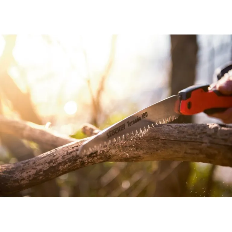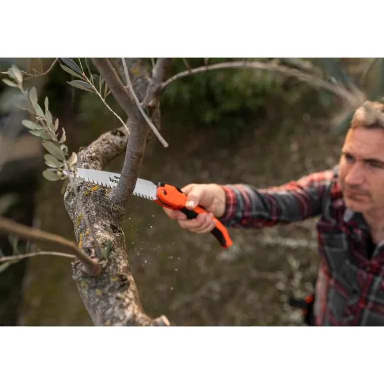 Seghetto pieghevole a lama dritta, con chiusura automatica, per uso professionale, per tutti i lavori di potatura e giardinaggio, realizzato con materiali di alta qualità. Grazie al trattamento termico ad impulsi, le punte dei denti sono molto resistenti e di lunga durata e garantiscono un taglio perfetto. Tutti i ricambi sono facilmente sostituibili. – Lama dritta in acciaio speciale cromato – Taglio tirante – Impugnatura ergonomica in polipropilene – Antiscivolo in morbida gomma sintetica (materiale TPA). Lunghezza lama: 18 cm Peso: 190 g