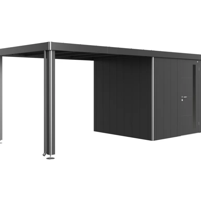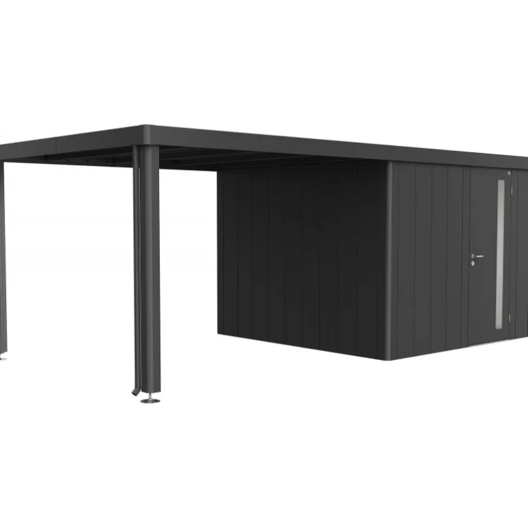 La tettoia laterale viene fissata alla Casetta NEO (a partire dalla mis. 2A) su uno o su entrambi i lati. La larghezza della tettoia laterale è di 3 m. I supporti in alluminio sono dotati di piedini regolabili in altezza. Sono inclusi due tubi pluviali.